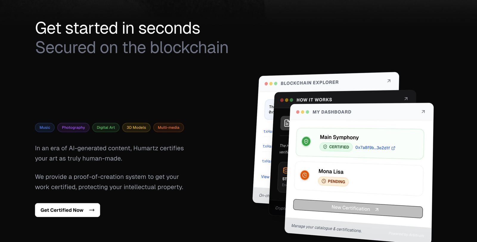 Descrição da ferramenta: Humartz é um protocolo criptográfico de “Prova de Criação” que utiliza a expertise humana e blockchain para verificar a autenticidade de obras artísticas, oferecendo uma certificação imutável de autoria e proteção de propriedade intelectual.