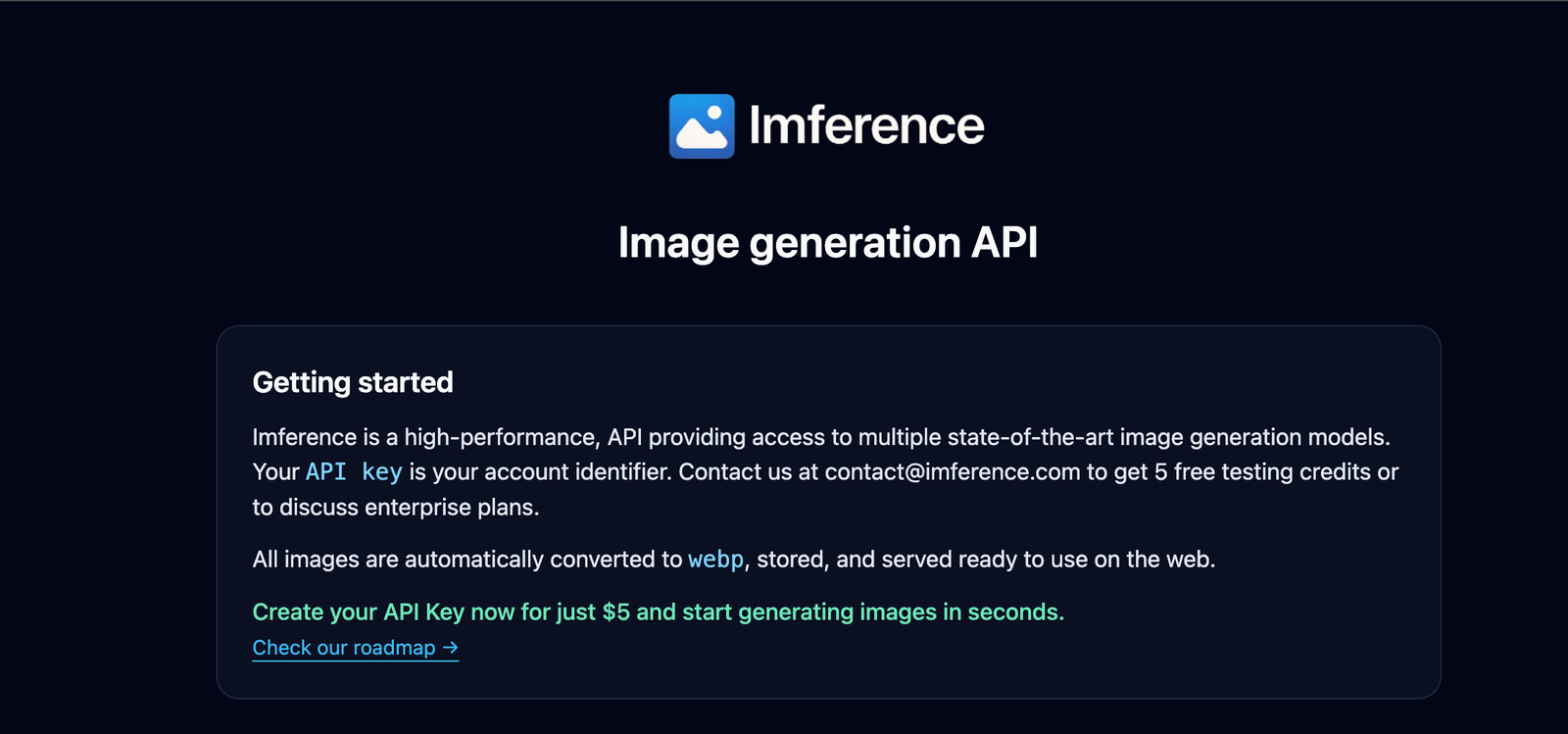 Descrição da ferramenta: Imference é uma API de alta performance que oferece acesso a diversos modelos avançados de geração de imagens, facilitando integrações e aplicações visuais automatizadas.