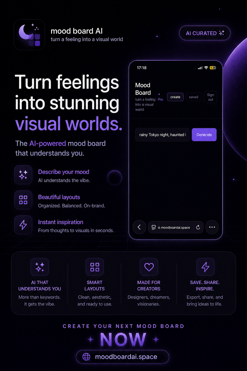 Descrição da ferramenta: Mood Board AI gera automaticamente painéis visuais completos a partir de qualquer sentimento ou estética, incluindo paletas de cores, tipografia, texturas e descrições cinematográficas, facilitando o processo criativo para profissionais de design e branding.