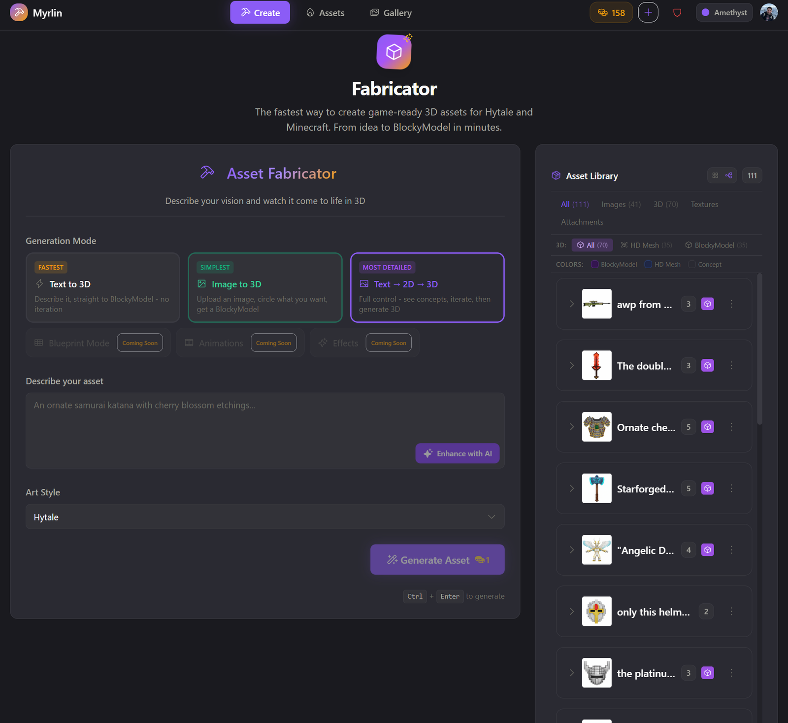 Descrição da ferramenta: Myrlin é uma ferramenta de geração de modelos 3D a partir de texto ou imagens, produzindo ativos otimizados para uso em motores de jogos, com exportação em formatos como GLB e OBJ.