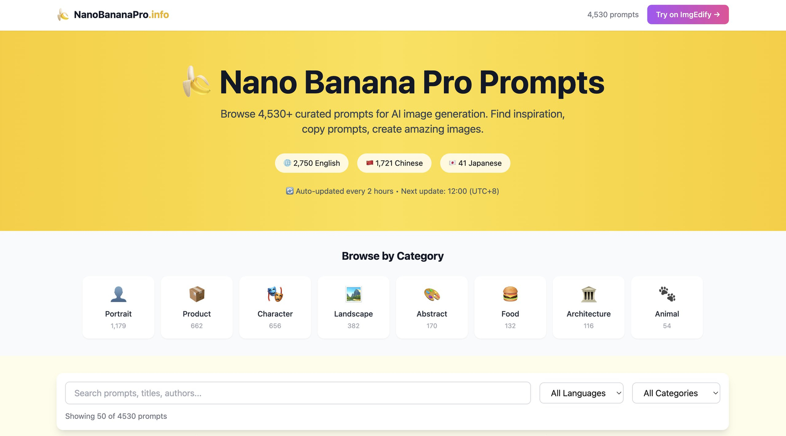Descrição da ferramenta: Biblioteca curada com mais de 4.000 prompts de alta qualidade para o Nano Banana Pro, ferramenta de geração de imagens por IA do Google Gemini, oferecendo recursos de busca, categorização e suporte multilíngue.
