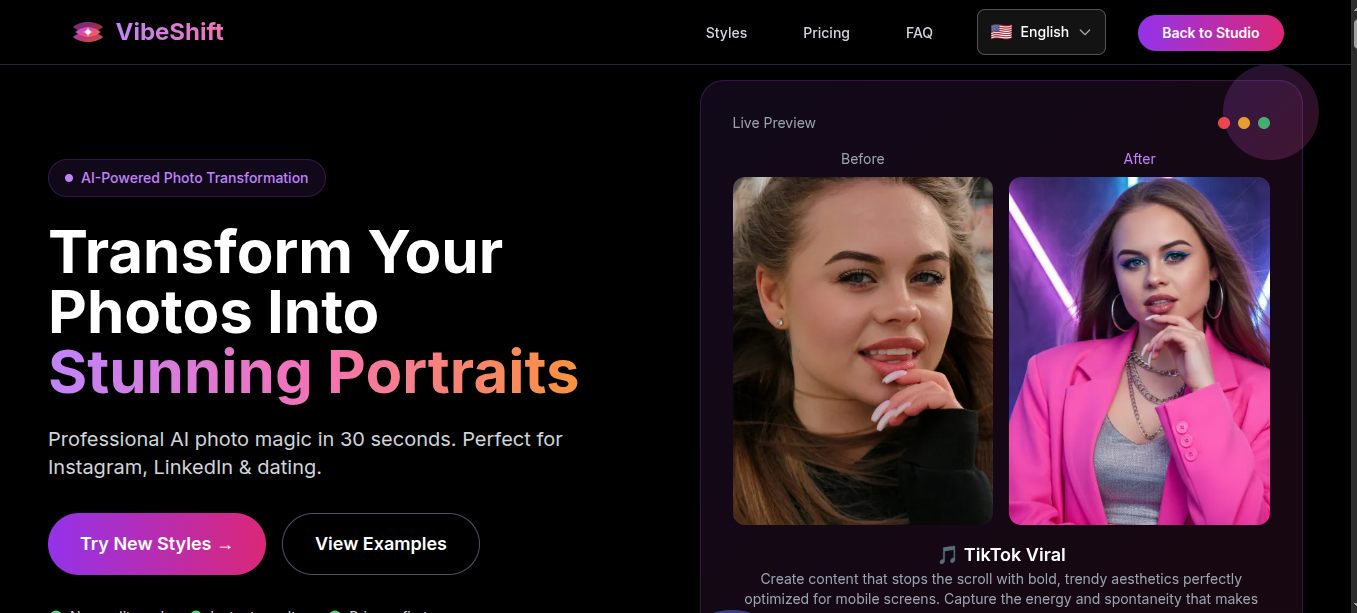 Descrição da ferramenta: Vibeshift é uma plataforma de inteligência artificial que transforma fotos em 23 estilos estéticos virais em apenas 60 segundos, oferecendo resultados de alta qualidade sem necessidade de sessões fotográficas profissionais ou longas esperas.