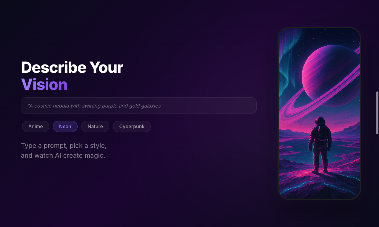 ⚡ Geração rápida: Cria wallpapers HD únicos em segundos a partir de uma descrição textual.