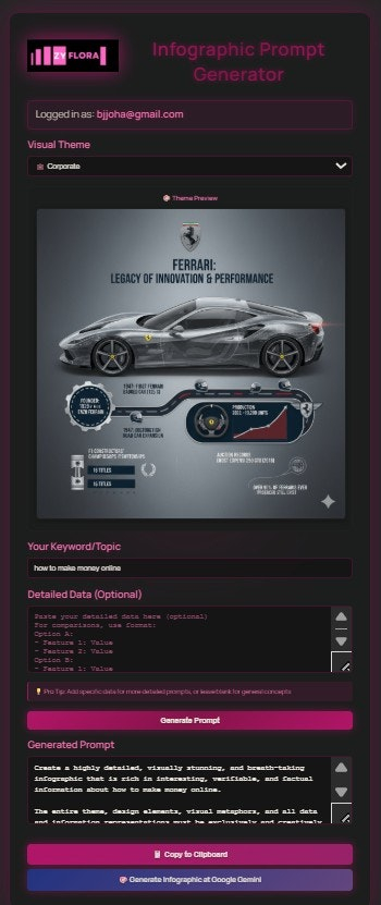 Descrição da ferramenta: Gerador de prompts para infográficos profissionais, que cria sugestões em 90 segundos compatíveis com qualquer gerador de imagens AI, facilitando a produção de conteúdo visual atrativo e compartilhável sem custos recorrentes.
