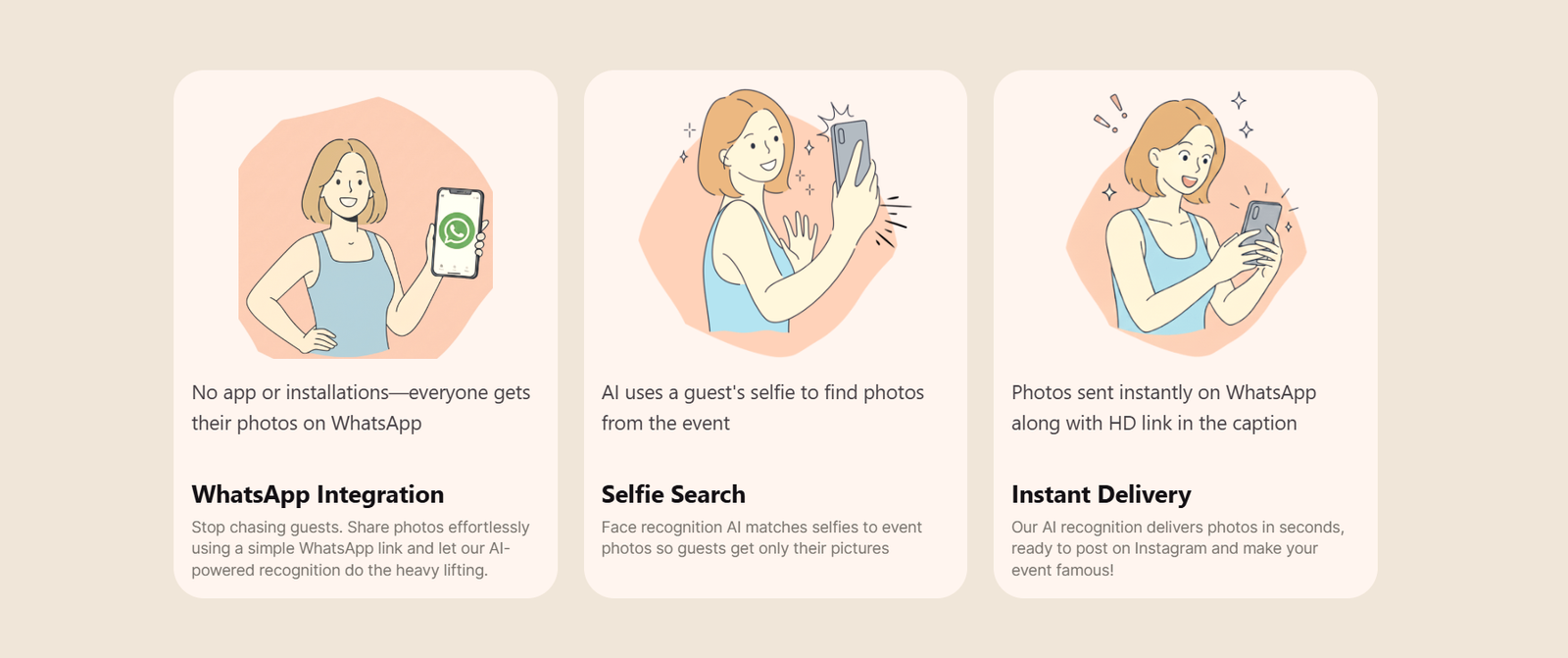💰 Custo acessível: Valor baixo de ₹0.2 por foto entregue, tornando a ferramenta econômica para eventos.