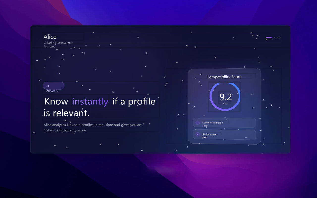 Descrição da ferramenta: Alice é uma extensão para Chrome que identifica leads relevantes no LinkedIn usando um sistema de pontuação inteligente, além de gerar comentários e mensagens com IA para facilitar conexões humanas autênticas.
