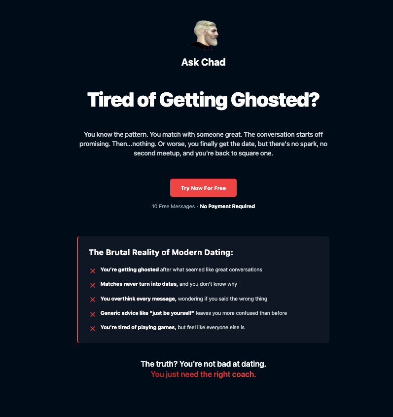 Descrição da ferramenta: AskChad é uma inteligência artificial que atua como coach de relacionamento 24/7, oferecendo orientações personalizadas em tempo real para melhorar conversas e aumentar as chances de sucesso nos encontros amorosos.