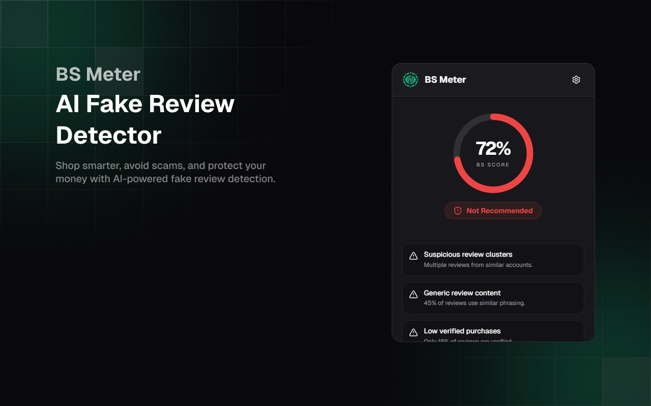 Descrição da ferramenta: O BS Meter é uma extensão de navegador com inteligência artificial que identifica avaliações falsas de produtos em segundos, auxiliando na tomada de decisões de compra mais seguras e confiáveis.