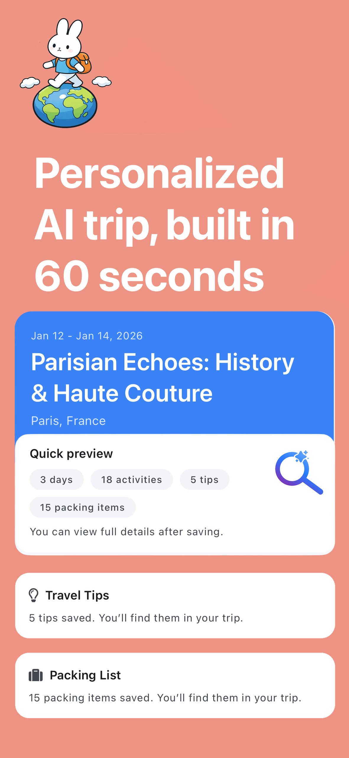 🗺️ Criando roteiros personalizados: Planeja viagens com base nas preferências do usuário, como horários de despertar ou estilos de viagem.