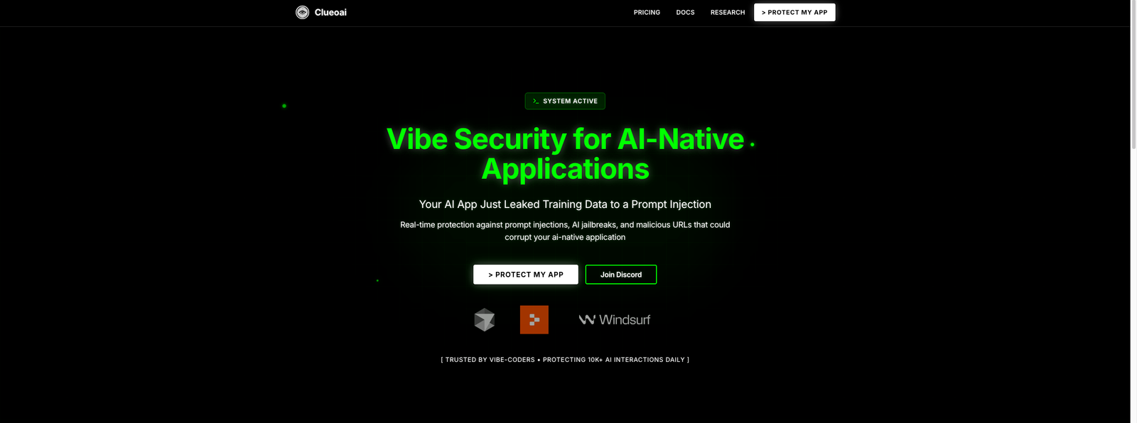 Descrição da ferramenta: ClueoBots by Clueoai oferece proteção em tempo real contra injeções de prompts, jailbreaks de IA e URLs maliciosas, garantindo a integridade e segurança de aplicações nativas de inteligência artificial.