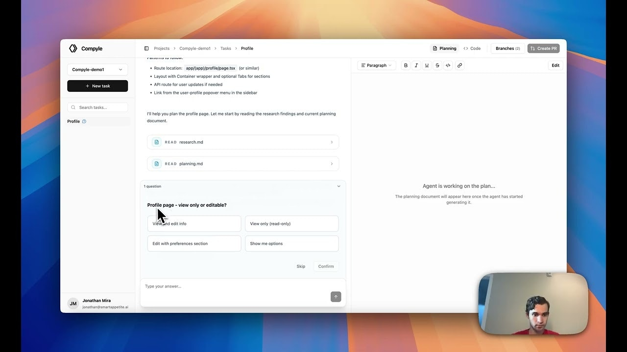 Compyle é um agente de codificação colaborativo que interage ativamente com o usuário, planejando, perguntando e verificando antes de gerar código, possibilitando maior confiança em projetos complexos e ambíguos.