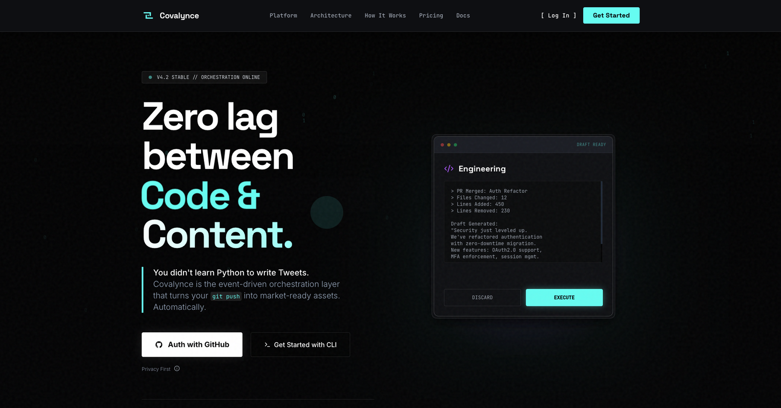 Descrição da ferramenta: Covalynce é uma plataforma que proporciona integração instantânea entre código e conteúdo, otimizando a colaboração de equipes técnicas modernas com baixa latência e alta eficiência.