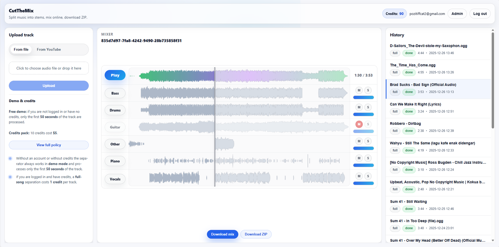 CutTheMix é uma ferramenta online que separa stems de áudio, permitindo remover vocais, isolar bateria ou guitarra para remixagem, prática ou criação de faixas de karaokê.
