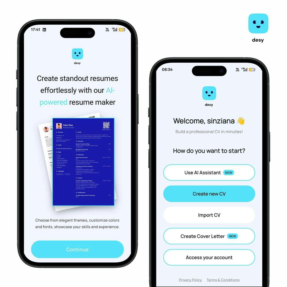 Descrição da ferramenta: Desy é uma plataforma de criação de currículos com inteligência artificial, oferecendo modelos criativos e recursos de aprimoramento de texto para gerar currículos modernos e visualmente atraentes.