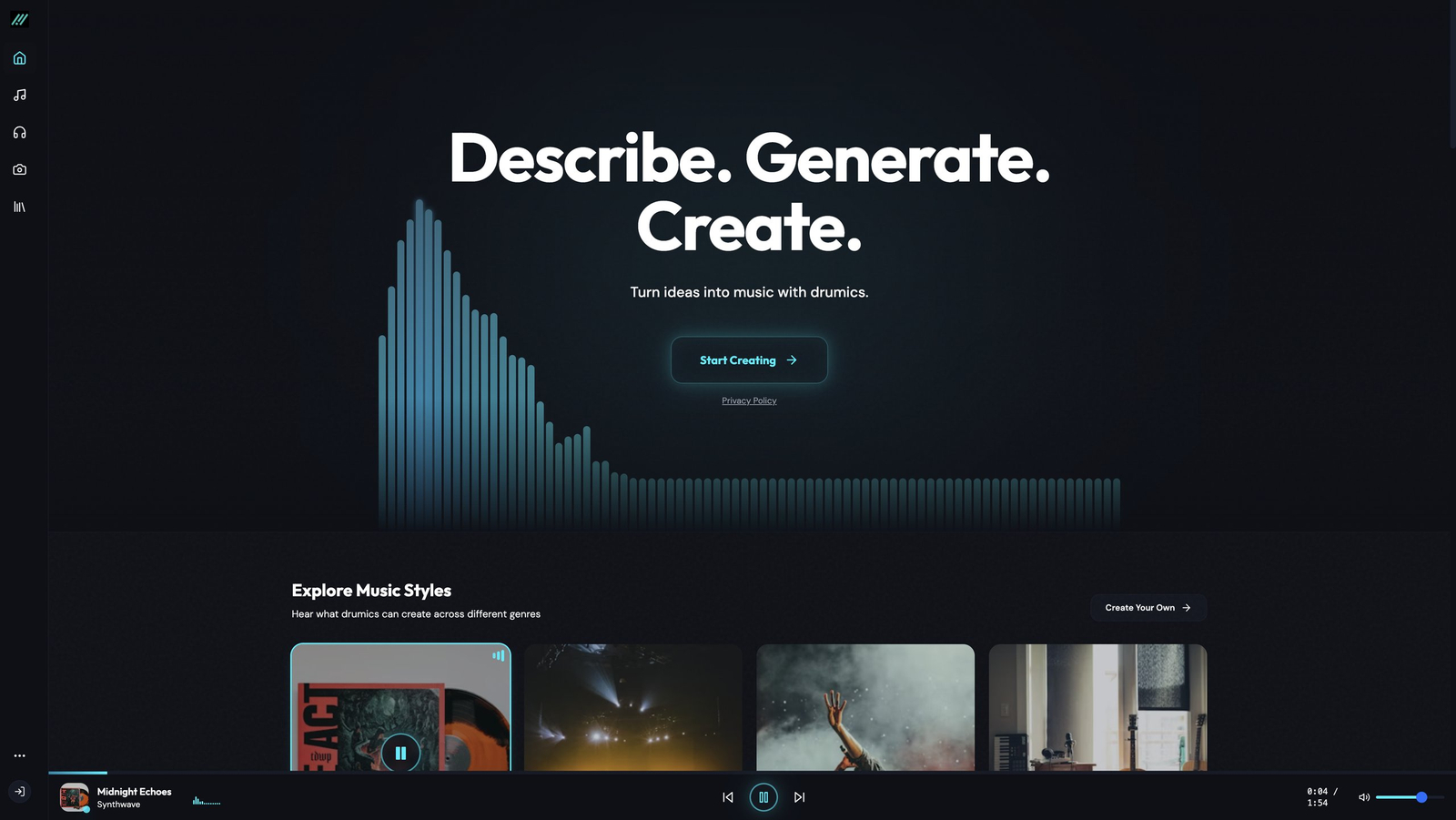 Descrição da ferramenta: Drumics é uma plataforma que converte descrições de palavras e fotos em músicas de alta qualidade, permitindo a criação rápida e fácil de faixas sem necessidade de habilidades musicais, com conteúdo totalmente livre de royalties.
