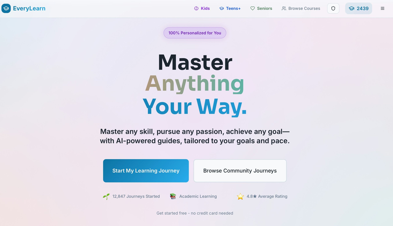 EveryLearn é uma plataforma de aprendizado personalizada que utiliza inteligência artificial para criar jornadas de estudo sob medida, alinhadas aos objetivos e ritmo de cada usuário, promovendo desenvolvimento eficiente em diversas áreas.