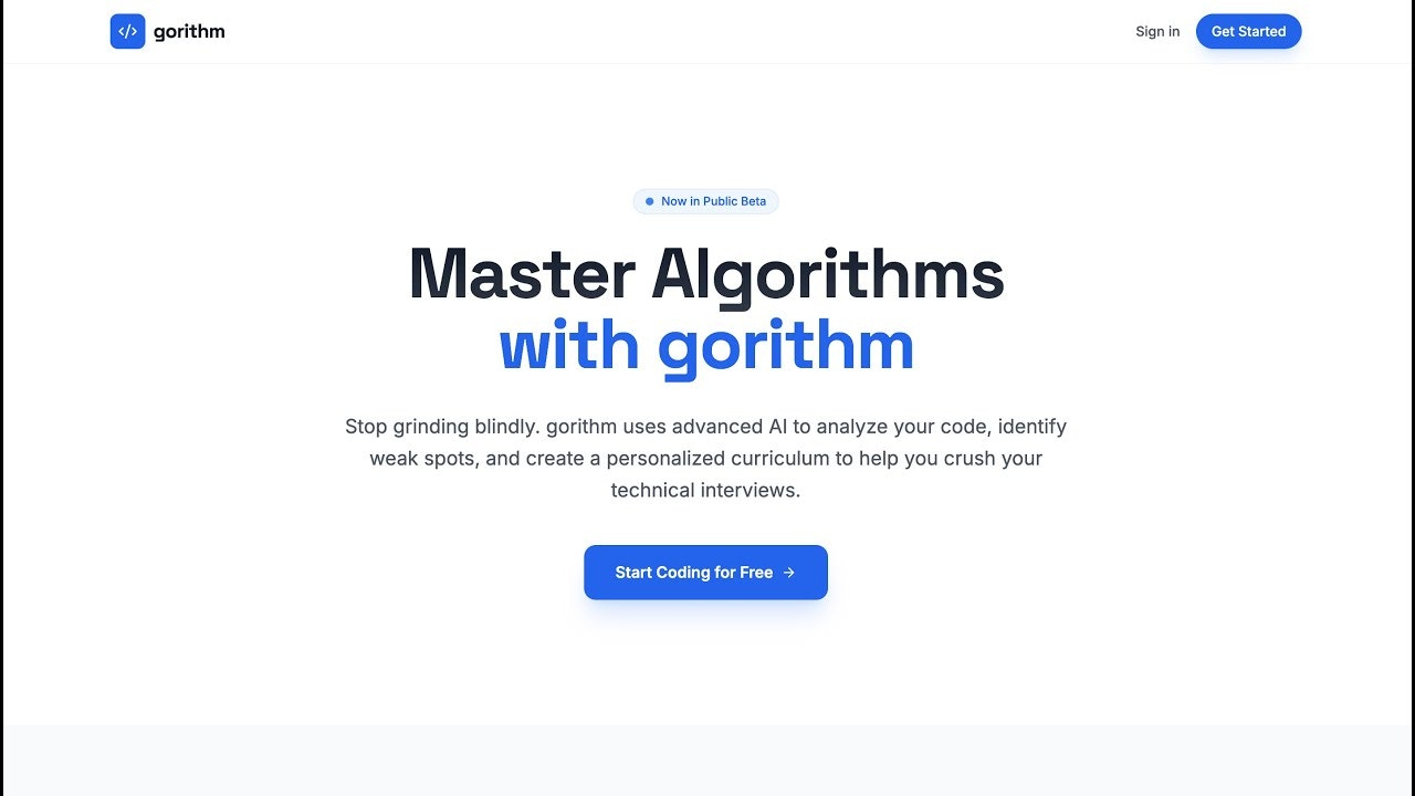 Descrição da ferramenta: Gorithm.dev é uma plataforma de aprendizado de algoritmos que utiliza inteligência artificial para orientar o usuário na compreensão de padrões, promovendo uma aprendizagem intuitiva e prática, além de preparar para entrevistas de programação.