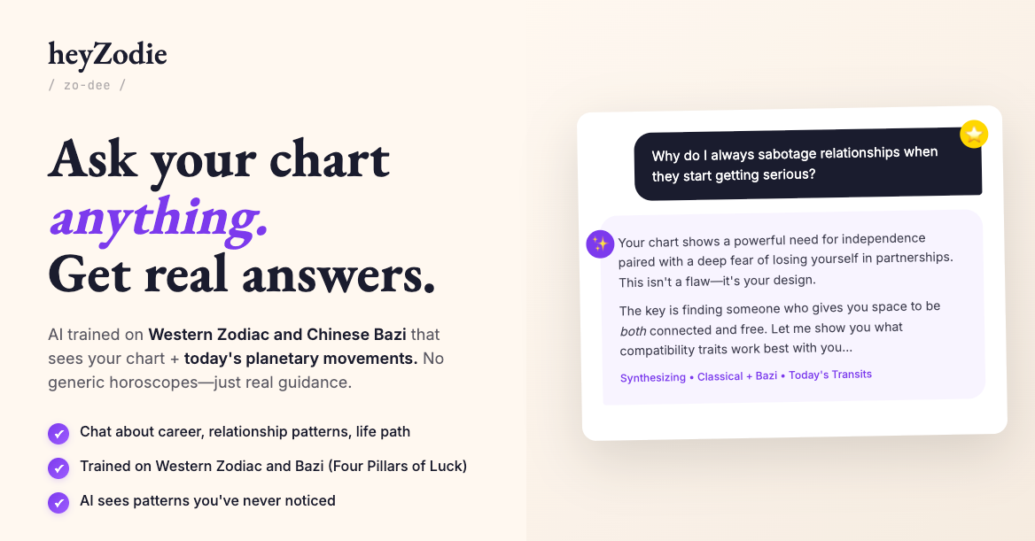 Descrição da ferramenta: HeyZodie é uma ferramenta de astrologia baseada em inteligência artificial que combina Astrologia Ocidental e Bazi (Chinesa) para identificar forças ocultas, padrões de vida recorrentes e oferecer orientações práticas para o desenvolvimento pessoal.