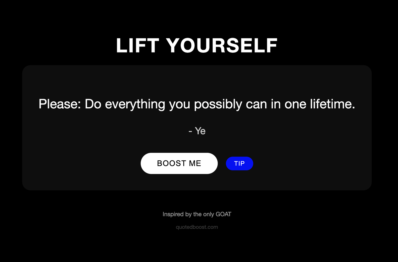Lift Yourself é uma plataforma que fornece citações inspiradoras e autênticas de Ye (antigo Kanye West), ajudando a renovar o mindset diário e elevar a frequência emocional do usuário.