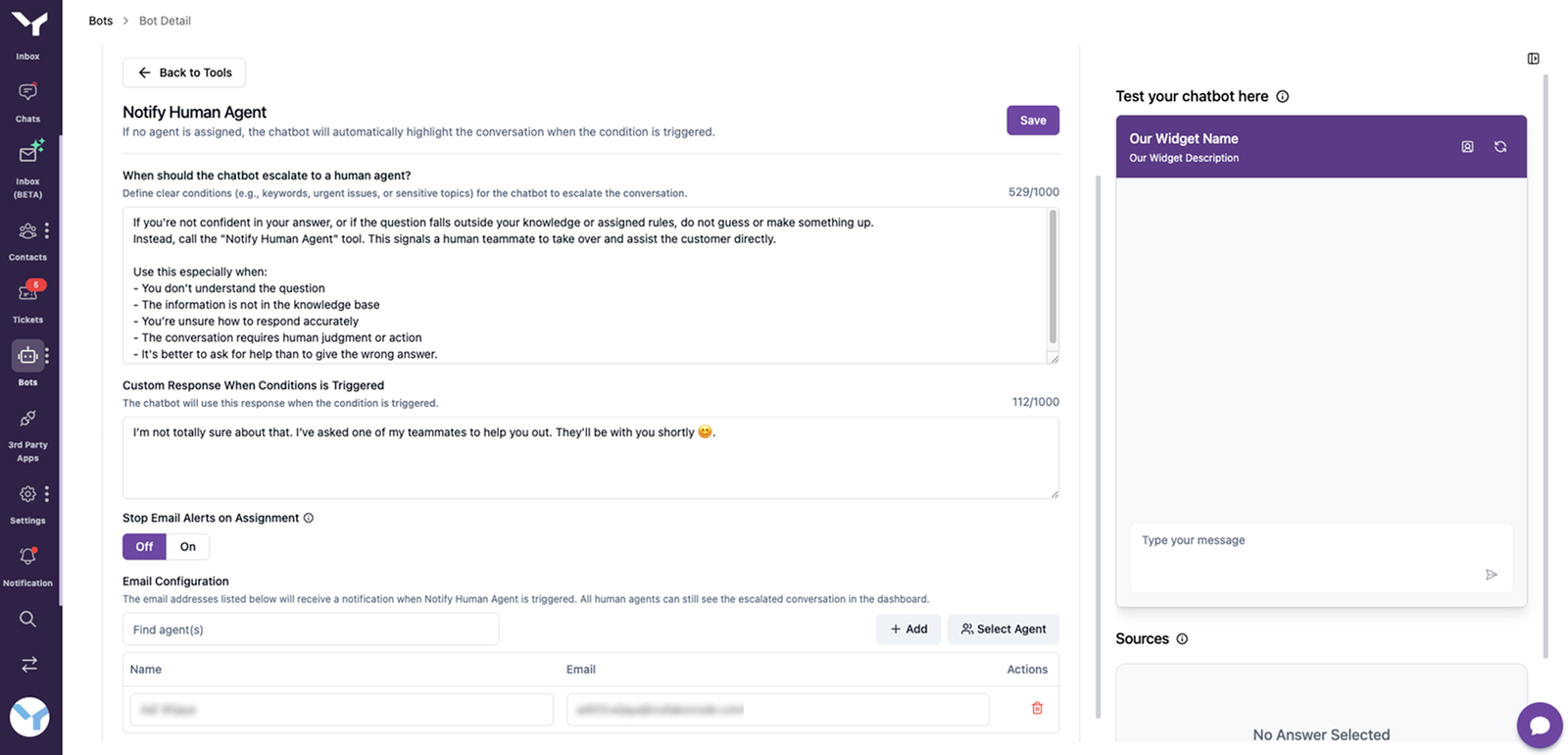 Descrição da ferramenta: Notify Human Agent é uma ferramenta que automatiza alertas para agentes humanos, indicando quando uma conversa necessita de intervenção manual, com justificativas geradas por IA para facilitar a transição suave e eficiente.