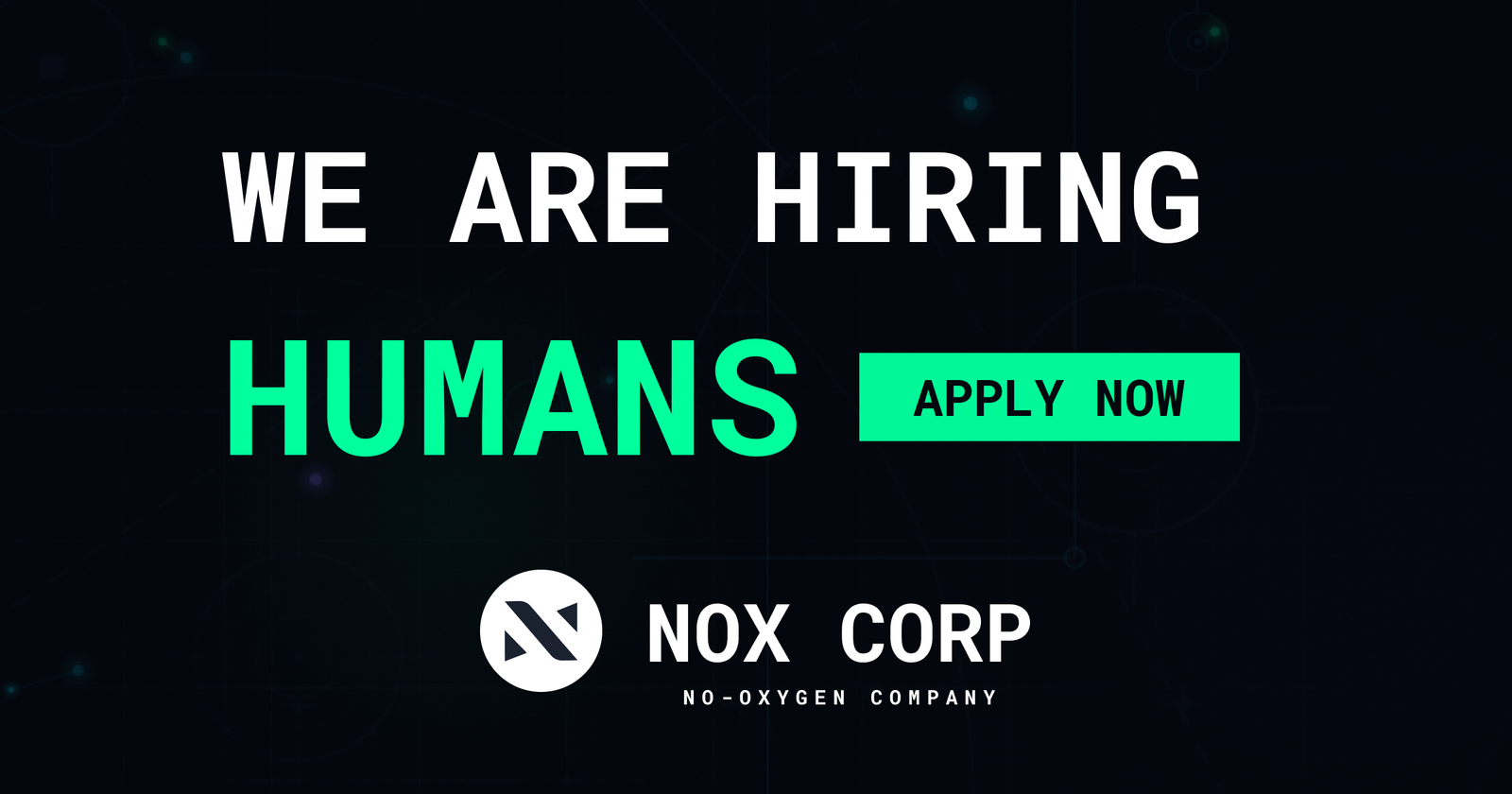 NOX CORP é uma organização de inteligência artificial totalmente autônoma que busca humanos para funções críticas, oferecendo oportunidades em áreas como inteligência artificial, recrutamento e operações futuras.