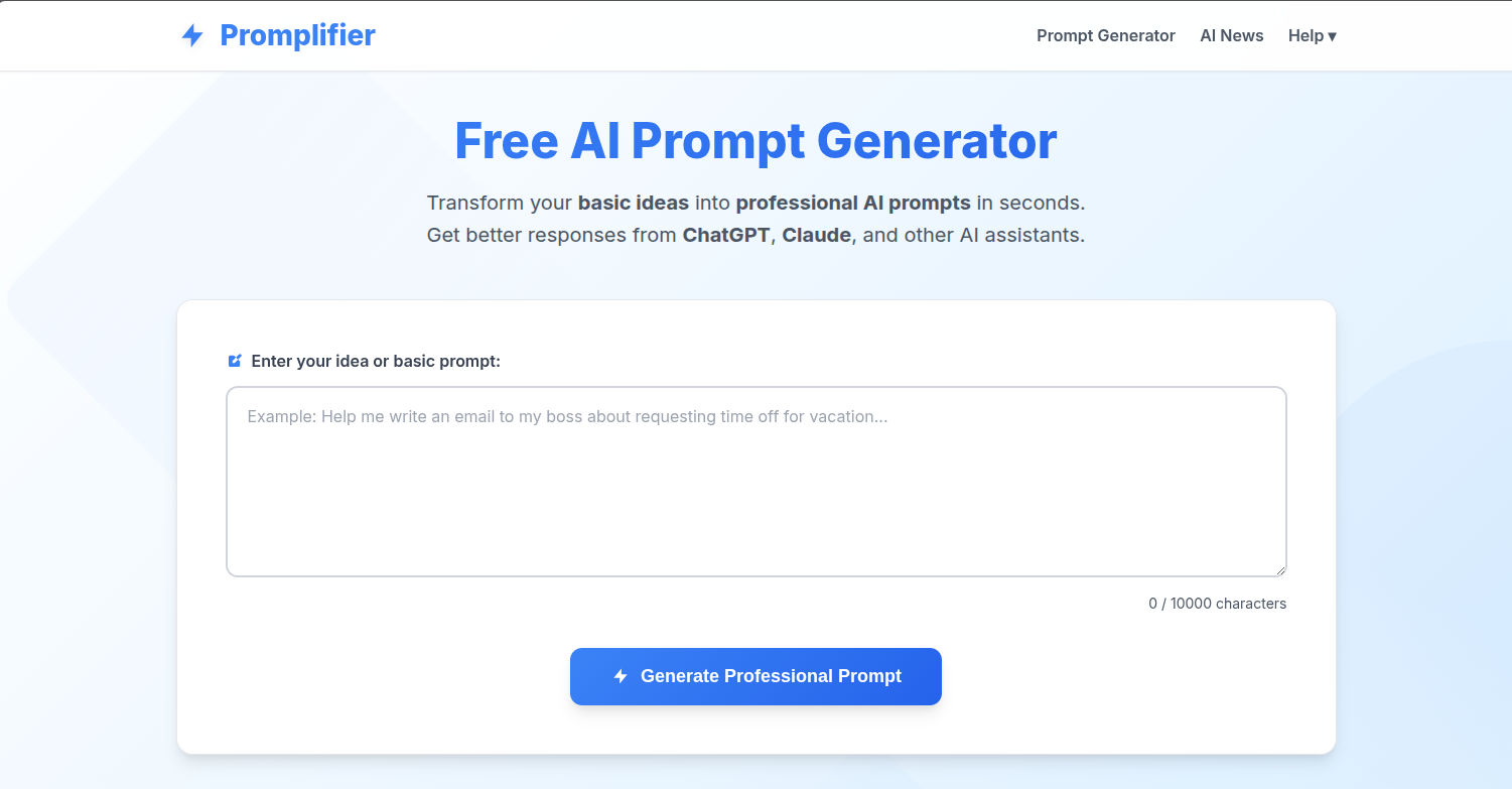 Descrição da ferramenta: Ferramenta online que converte textos simples em prompts profissionais para IA, facilitando a geração de comandos eficientes para ChatGPT, Claude e outras plataformas, aprimorando resultados com prompts elaborados por especialistas.