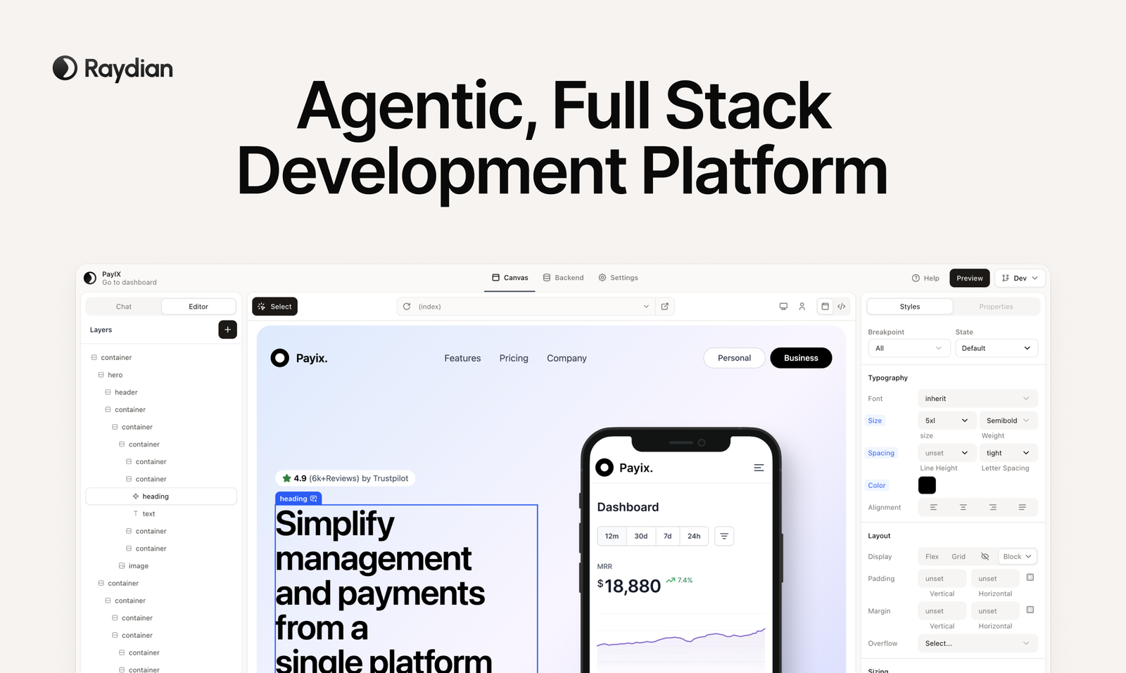 Descrição da ferramenta: Raydian é uma plataforma de desenvolvimento de produtos full stack baseada em IA, que possibilita criar webapps de forma estruturada, com editor visual, backend integrado, banco de dados, autenticação e hospedagem.