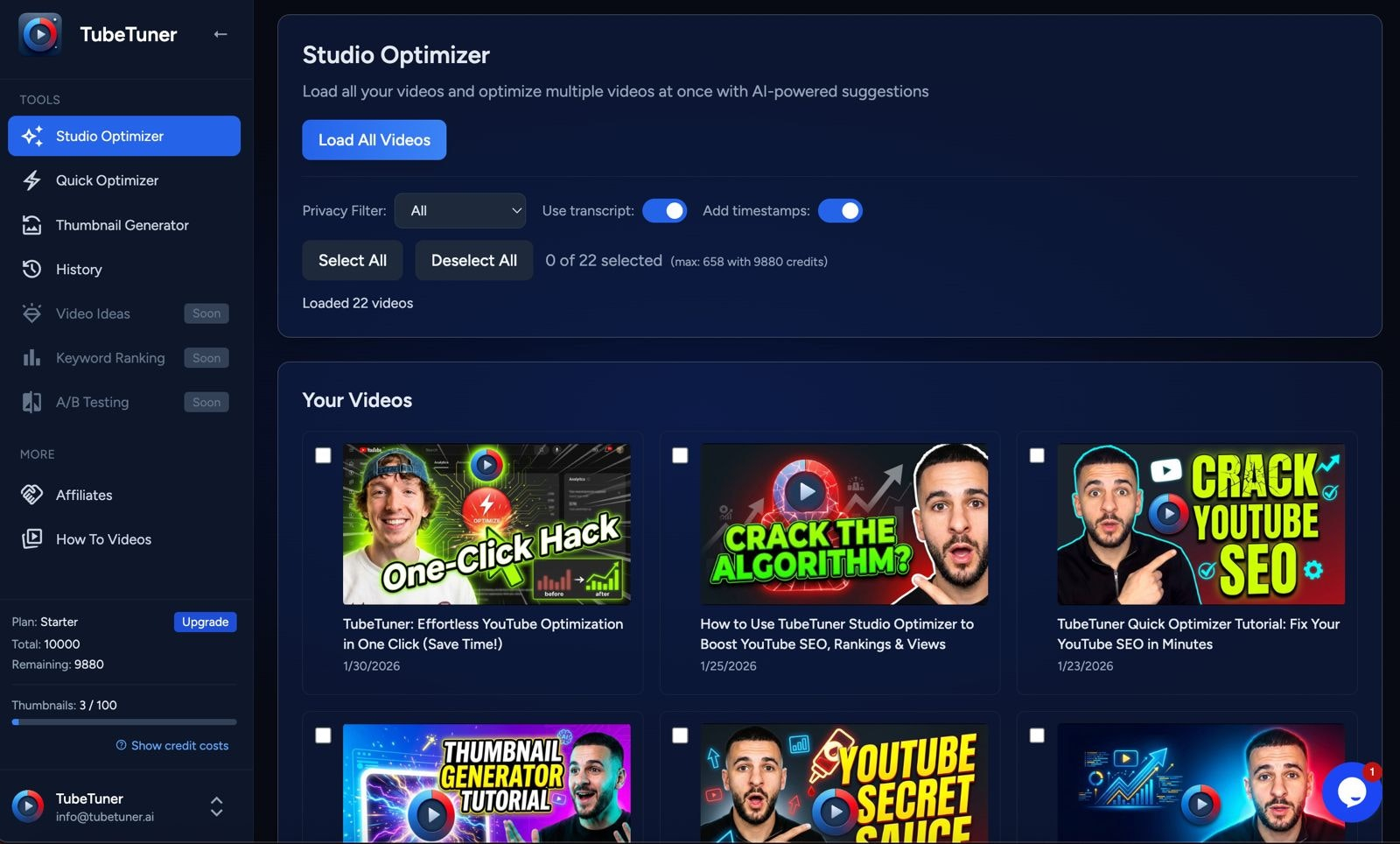 Descrição da ferramenta: TubeTuner automatiza a geração de títulos, descrições, tags e miniaturas otimizadas para YouTube, acelerando o processo de otimização de vídeos e canais com alta eficiência e qualidade.