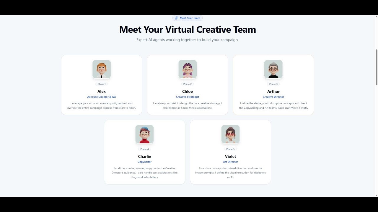 🎯 Especialização por Perfil: Equipe virtual composta por especialistas em diferentes áreas, como estratégia, direção, redação e arte.