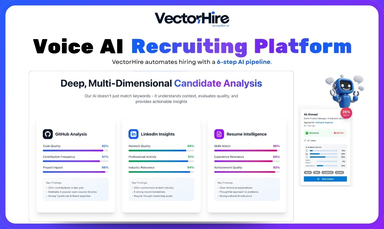 Descrição da ferramenta: VectorHire by Cognilium AI é um sistema de recrutamento automatizado que utiliza agentes autônomos para analisar currículos, perfis online e conduzir entrevistas por voz, proporcionando decisões de contratação rápidas e fundamentadas em minutos.