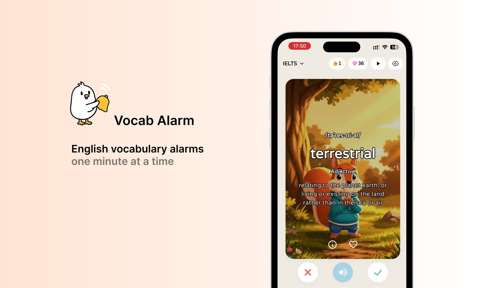 Descrição da ferramenta: Vocab Alarm é uma aplicação que utiliza IA, alarmes de palavras e repetição espaçada para facilitar o aprendizado de vocabulário avançado em inglês, promovendo retenção eficiente de até 10 mil palavras por meio de tópicos curados e jogos rápidos.