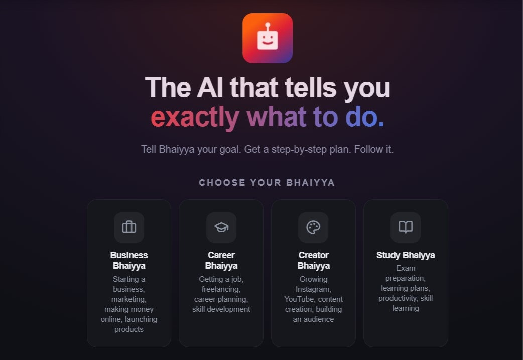 Descrição da ferramenta: AI Bhaiyya transforma objetivos em planos de ação detalhados, fornecendo passos claros, ferramentas recomendadas e prompts prontos para uso, facilitando a implementação prática de estratégias sem ambiguidades ou informações excessivas.