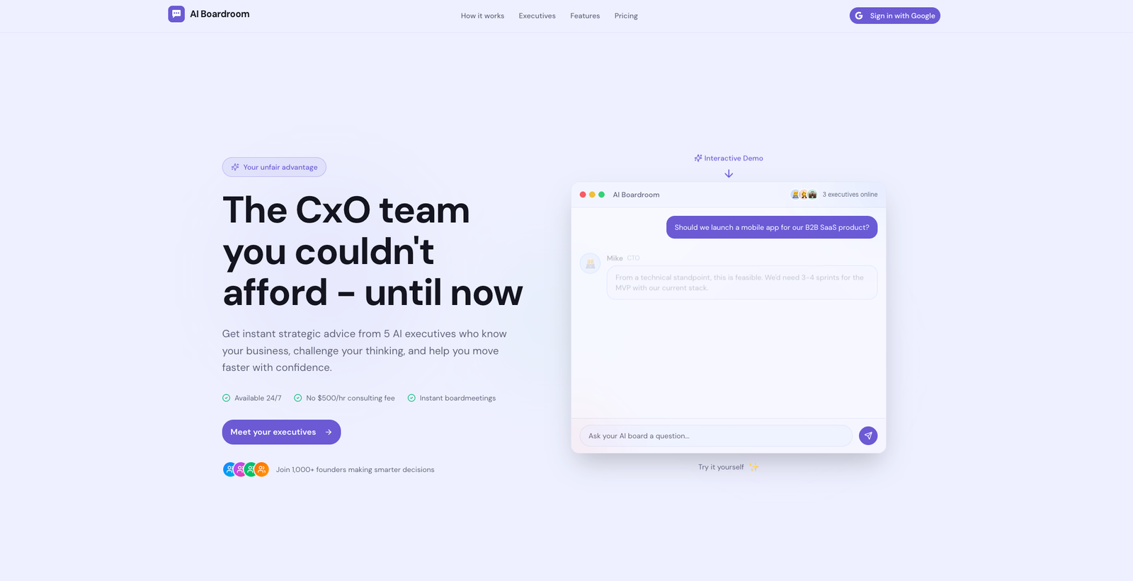Descrição da ferramenta: AI Boardroom é uma plataforma que fornece feedback estruturado de múltiplos papéis executivos simulados, auxiliando na tomada de decisões estratégicas, financeiras, de marketing, operações e tecnologia com diferentes perspectivas.