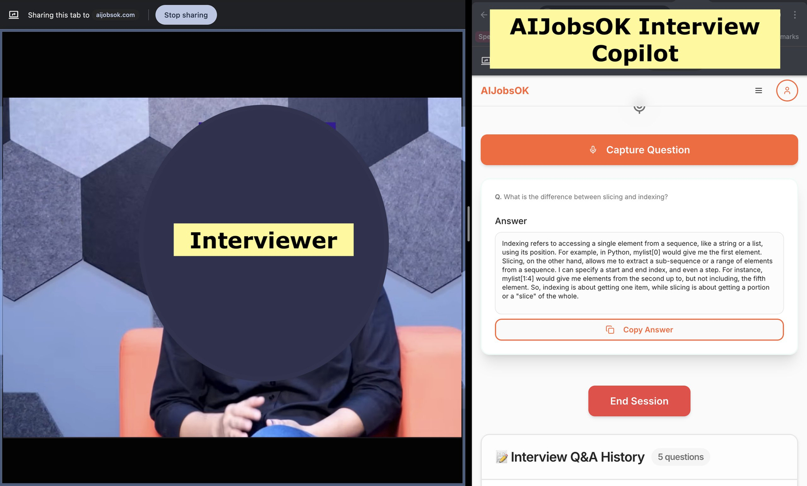 Descrição da ferramenta: AIJobsOK é uma ferramenta de inteligência artificial que escuta entrevistas ao vivo e sugere respostas personalizadas em tempo real, auxiliando candidatos durante videoconferências no Zoom, Google Meet e Teams, sem serem detectados pelo entrevistador.