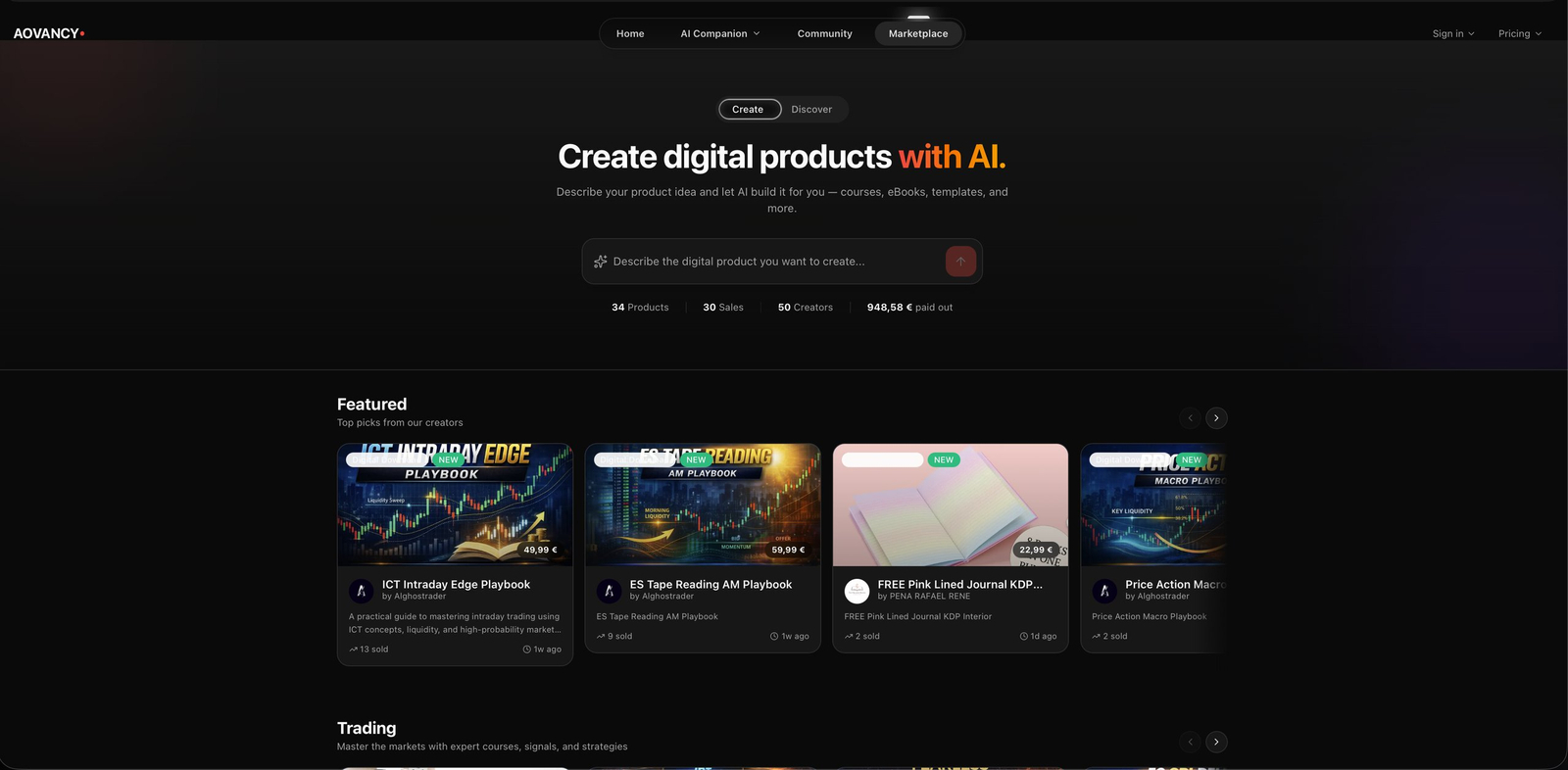 Descrição da ferramenta: AOVANCY é uma plataforma com inteligência artificial que permite criar e vender produtos digitais, como ebooks, cursos e templates, de forma rápida e sem necessidade de habilidades técnicas ou de design.