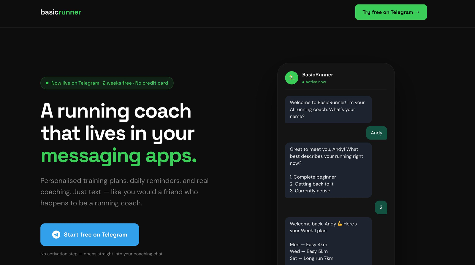 Descrição da ferramenta: Basic Runner é uma plataforma de treinamento personalizado baseada em inteligência artificial, que oferece planos de treino diários, coaching e acompanhamento através do WhatsApp, sem necessidade de download de aplicativo. Gratuito para os 50 primeiros corredores.