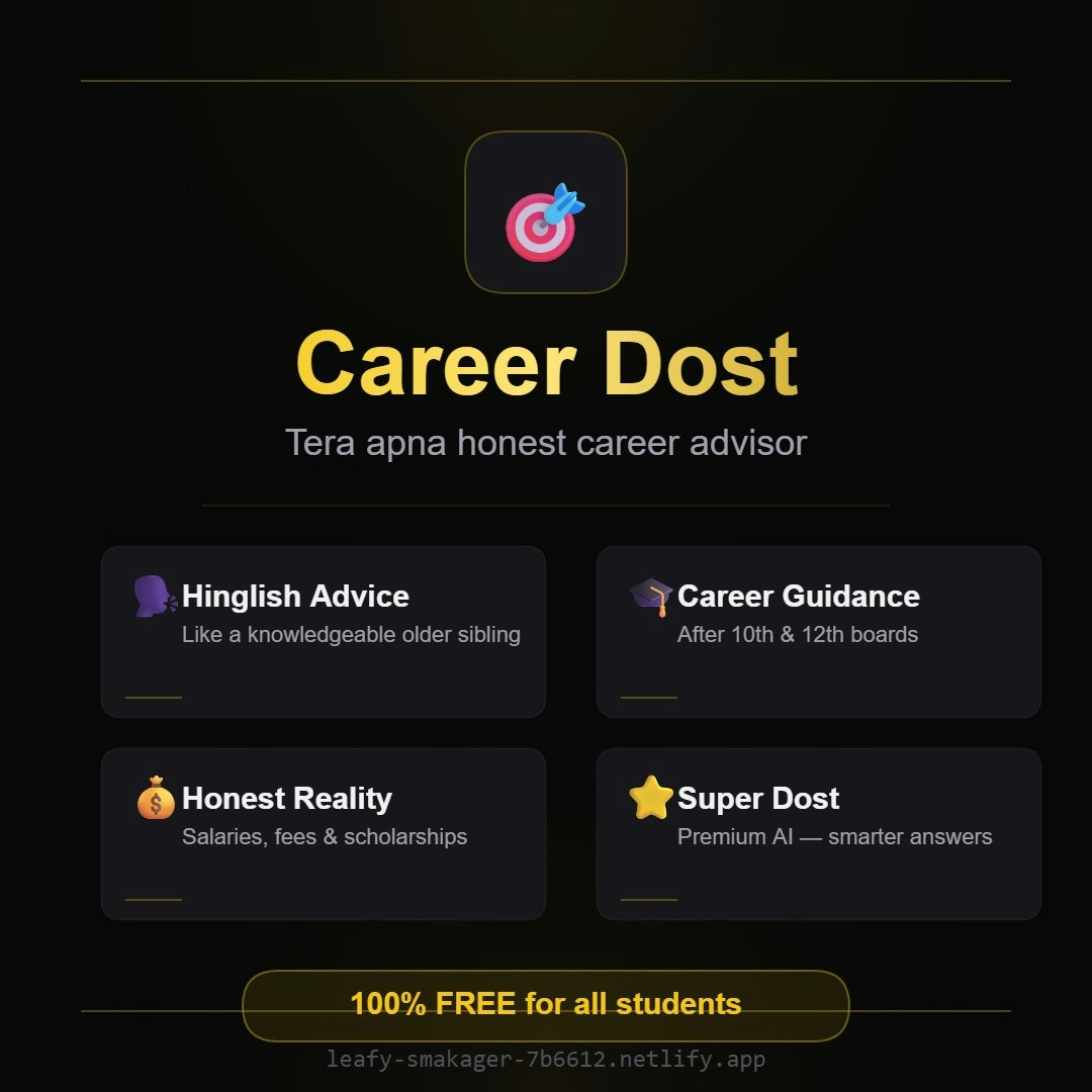 Descrição da ferramenta: Career Dost é uma plataforma que oferece aconselhamento de carreira em Hinglish, simulando a orientação de um irmão mais velho, com foco na realidade dos estudantes indianos e na pressão dos exames escolares.