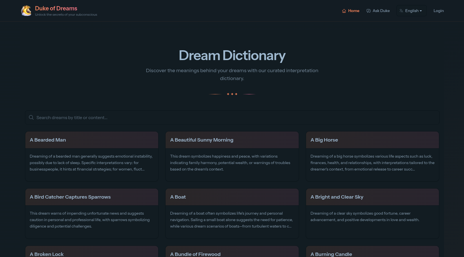 Descrição da ferramenta: Duke of Dreams é uma ferramenta baseada em inteligência artificial que interpreta sonhos instantaneamente, fornecendo insights sobre símbolos, temas e padrões a partir de descrições feitas pelo usuário.