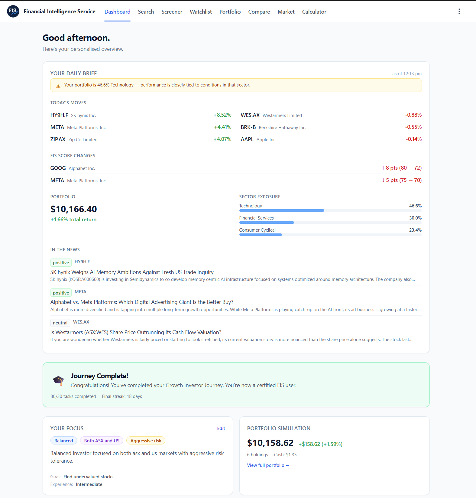 Descrição da ferramenta: O Financial Intelligence Service é uma plataforma que permite aos investidores analisar ações do ASX e dos EUA, atribuindo uma pontuação FIS de 0 a 100 com base em métricas de avaliação, crescimento, lucratividade, momentum e dividendos.