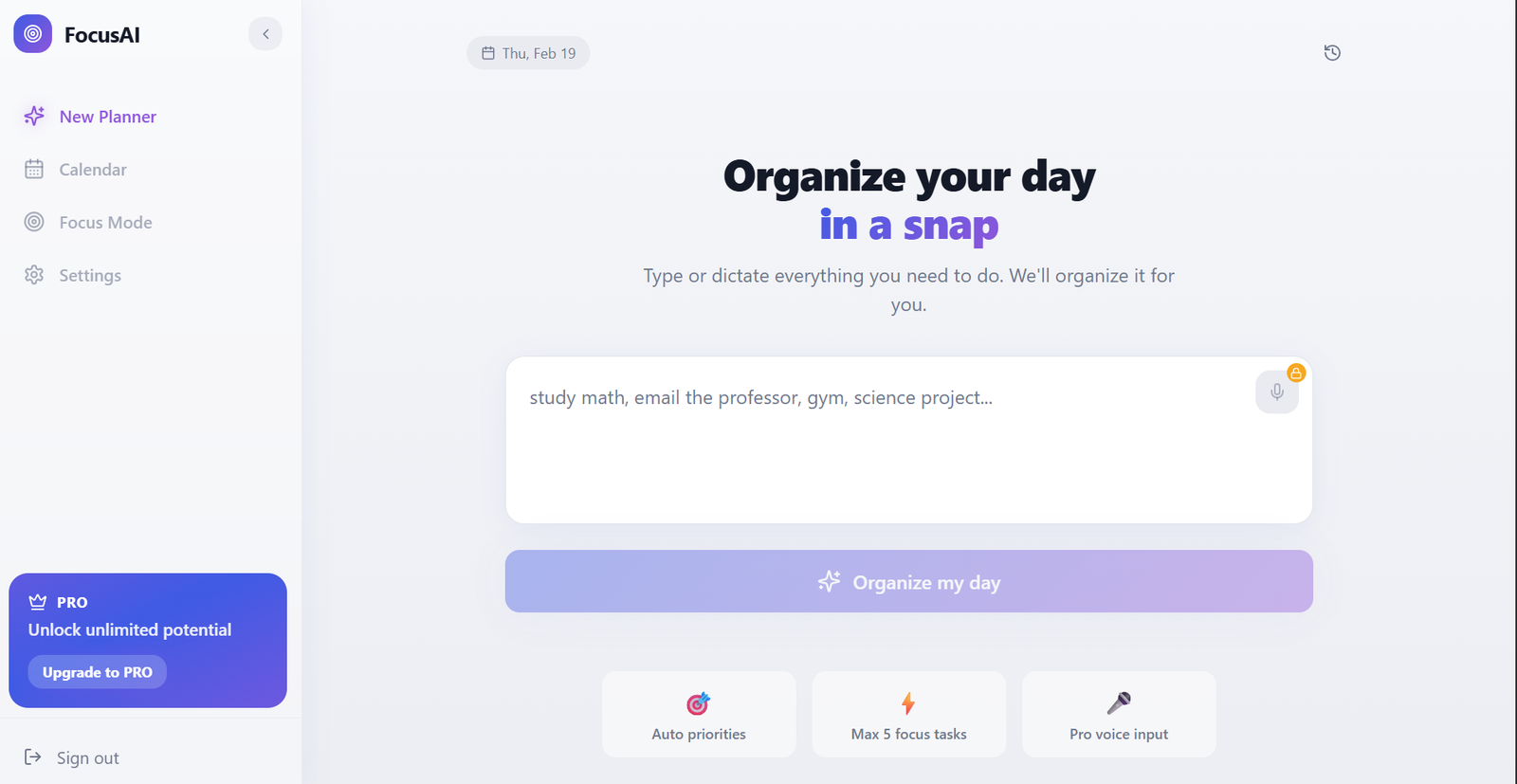 Descrição da ferramenta: Focus AI é um planejador de produtividade baseado em inteligência artificial que permite adicionar tarefas por texto ou voz, ajudando a definir prioridades de forma rápida, simples e eficiente.