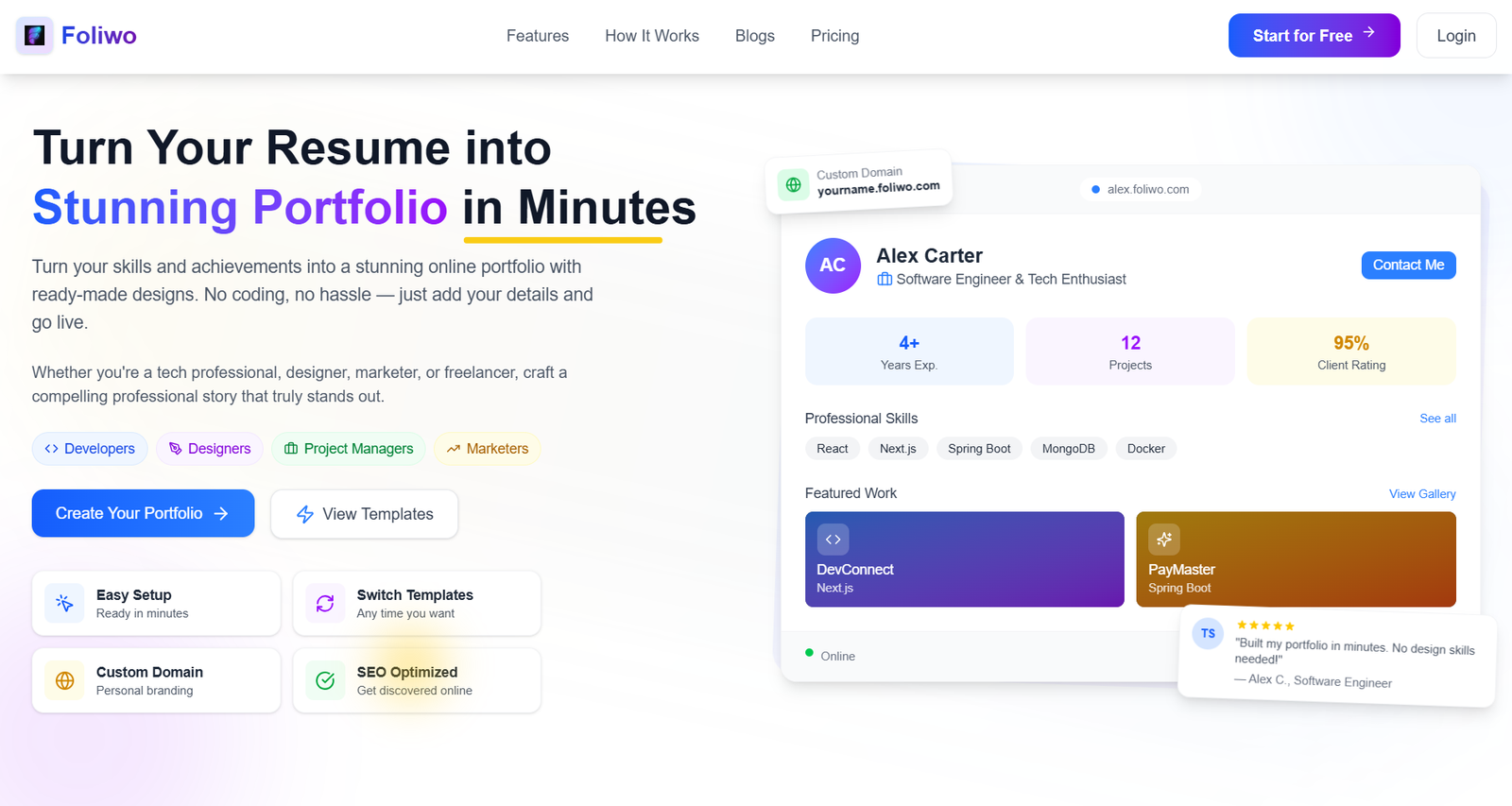 🌐 Domínio personalizado: Subdomínio gratuito (seunome.foliwo.com) para personalizar sua presença online.