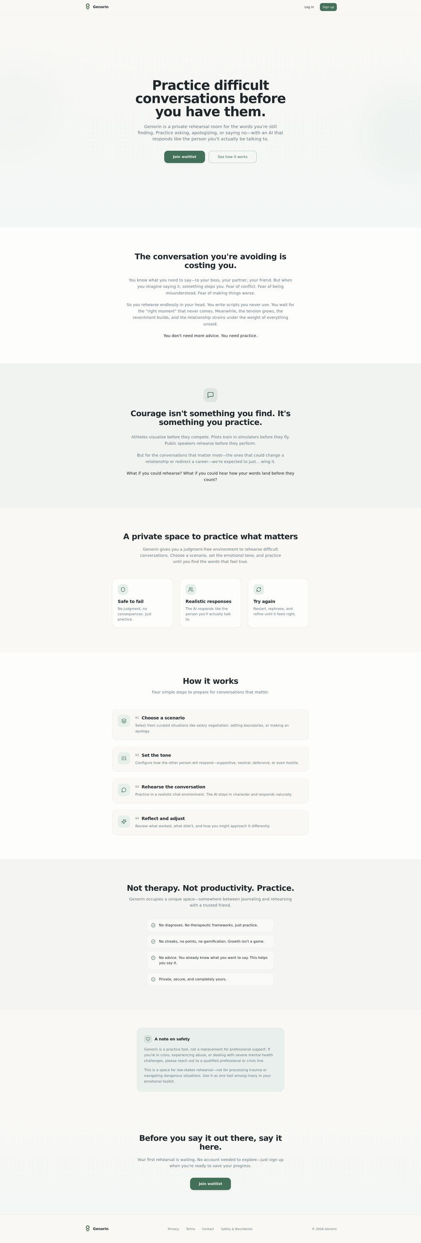 Genorin é uma aplicação privada que permite praticar conversas difíceis por meio de simulações textuais, oferecendo feedback estruturado e sem julgamentos para aprimorar habilidades de comunicação em contextos profissionais e pessoais.