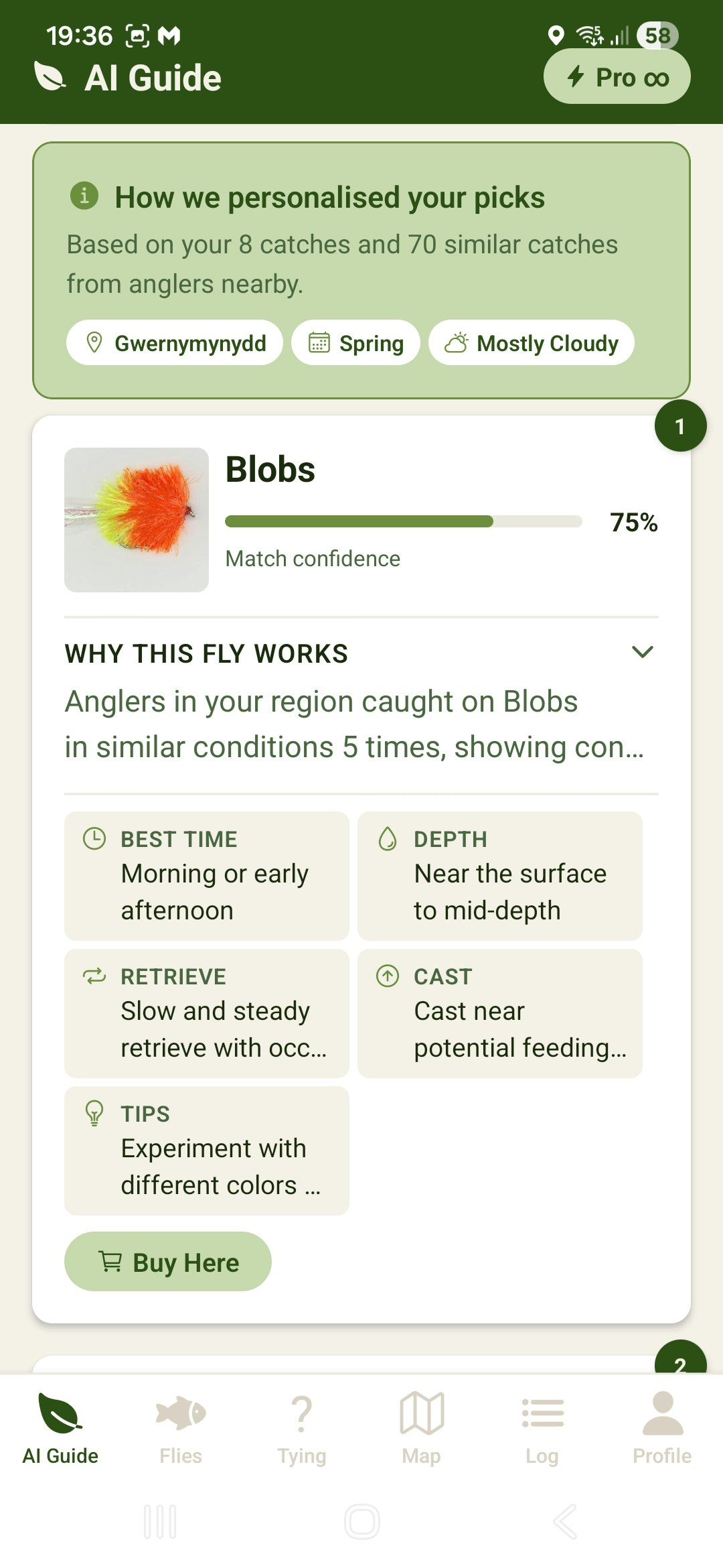 Descrição da ferramenta: Aplicativo inteligente que fornece recomendações em tempo real de padrões de moscas para pesca com isca artificial, considerando clima, estação e localização, otimizando a experiência do pescador.