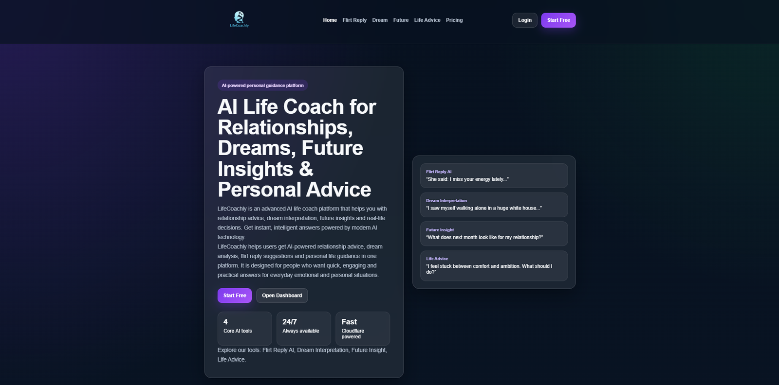 Descrição da ferramenta: LifeCoachly é uma plataforma alimentada por inteligência artificial que oferece sugestões de respostas para paquera, interpretação de sonhos, previsões futuras e orientações de vida personalizadas, auxiliando usuários em relacionamentos, autoconhecimento e situações cotidianas.
