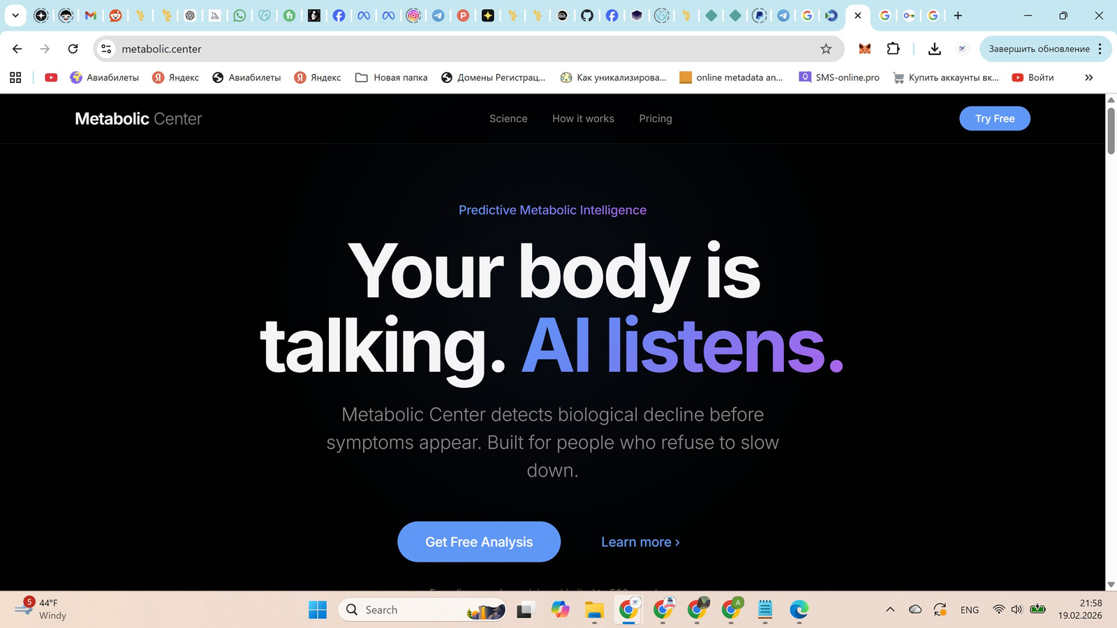 Descrição da ferramenta: O Metabolic Center é uma plataforma que analisa resultados de exames de sangue, fornecendo relatórios completos sobre saúde metabólica, idade biológica, riscos ocultos e recomendações personalizadas em poucos minutos via Telegram.