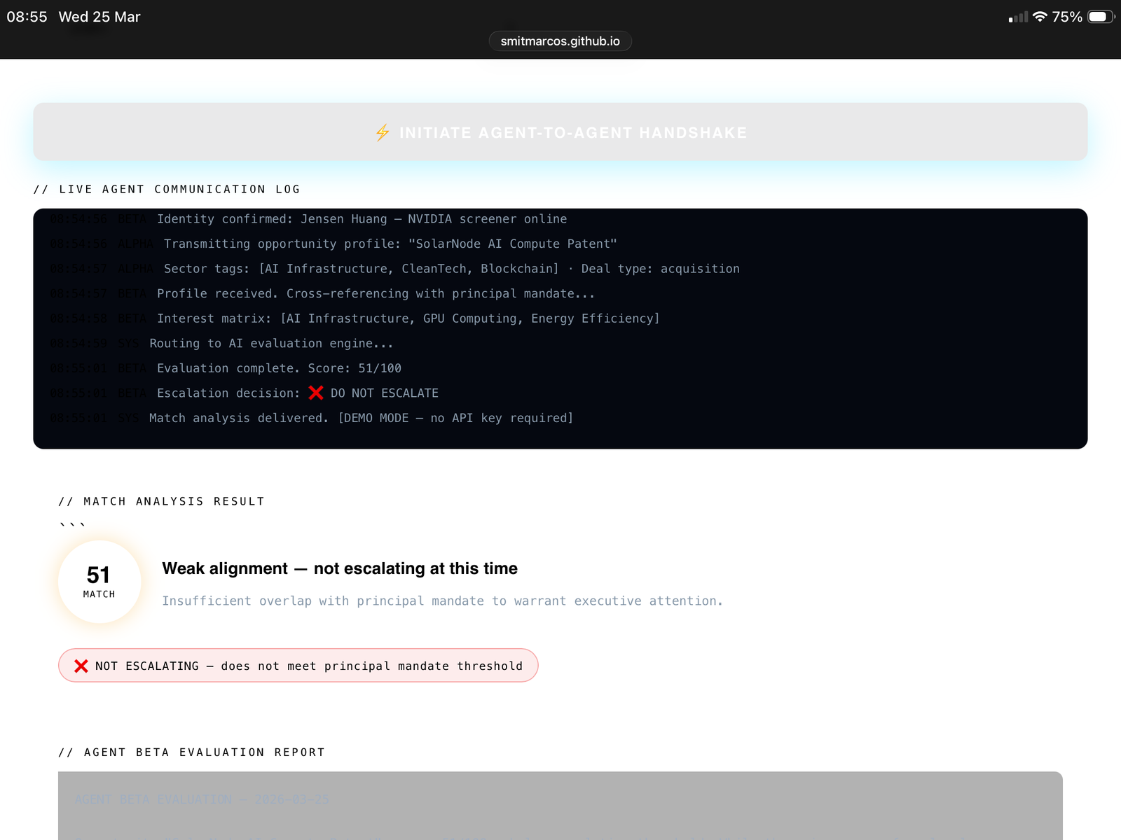 Descrição da ferramenta: NEXUS é um protocolo de correspondência entre agentes de IA, permitindo comunicação direta para identificar oportunidades e selecionar executivos, com filtragem automática e decisões em velocidade de máquina, reduzindo a intervenção humana ao essencial.