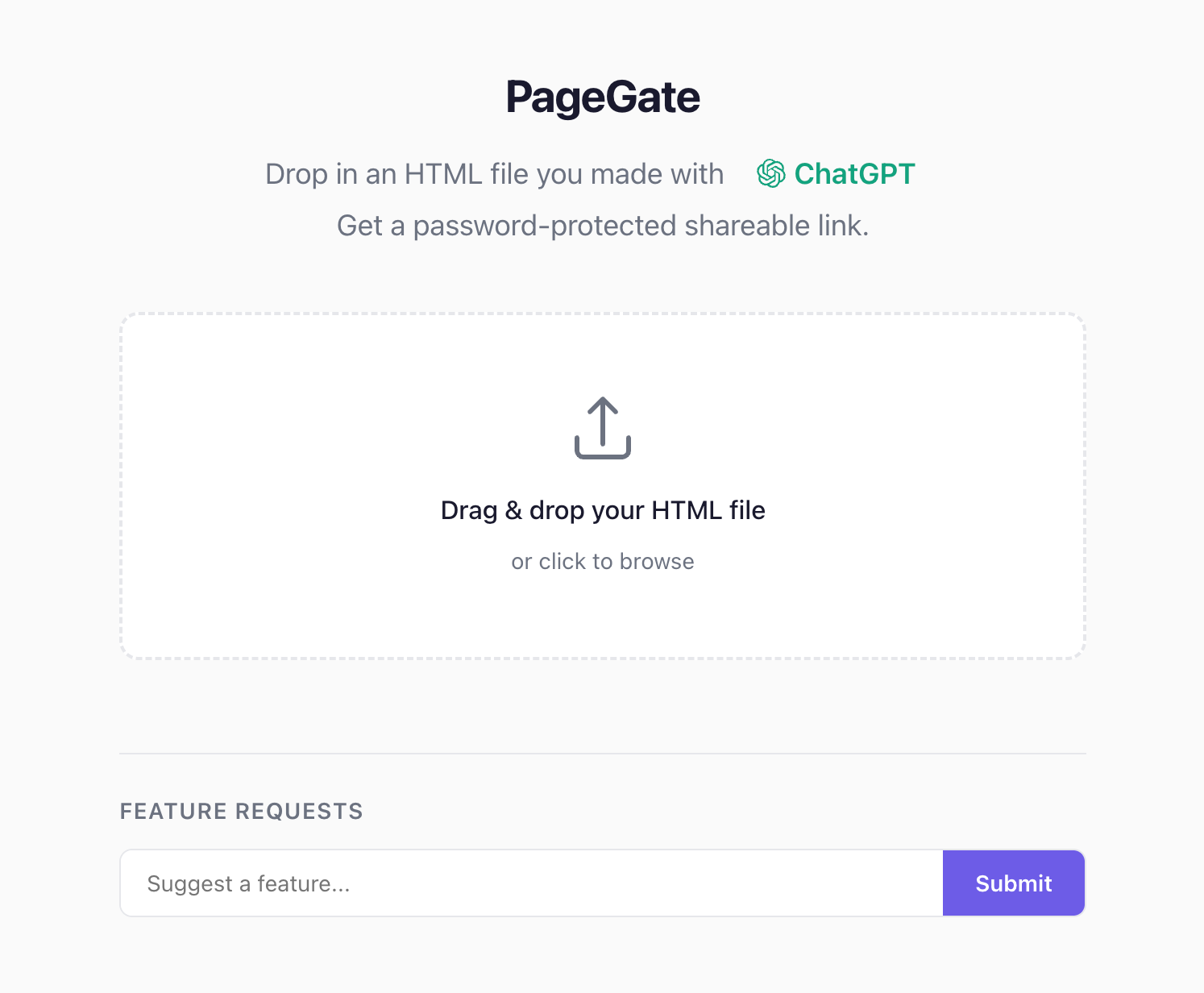 Descrição da ferramenta: PageGate é uma plataforma gratuita que permite usuários não técnicos compartilharem facilmente arquivos HTML gerados por IA, com links de acesso temporários e proteção por senha, facilitando a distribuição rápida e segura de conteúdos web.
