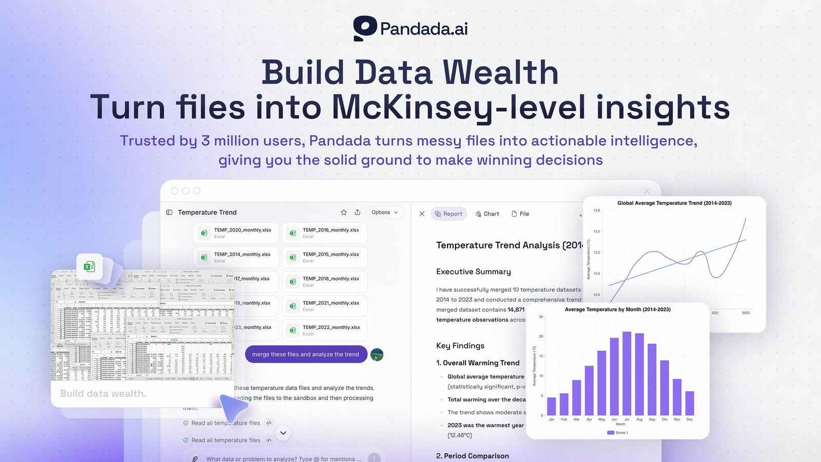 Descrição da ferramenta: Pandada AI converte arquivos diversos como CSV, PDFs, Excel e fotos em relatórios e apresentações profissionais, facilitando a análise de dados para operadores e cientistas de dados.