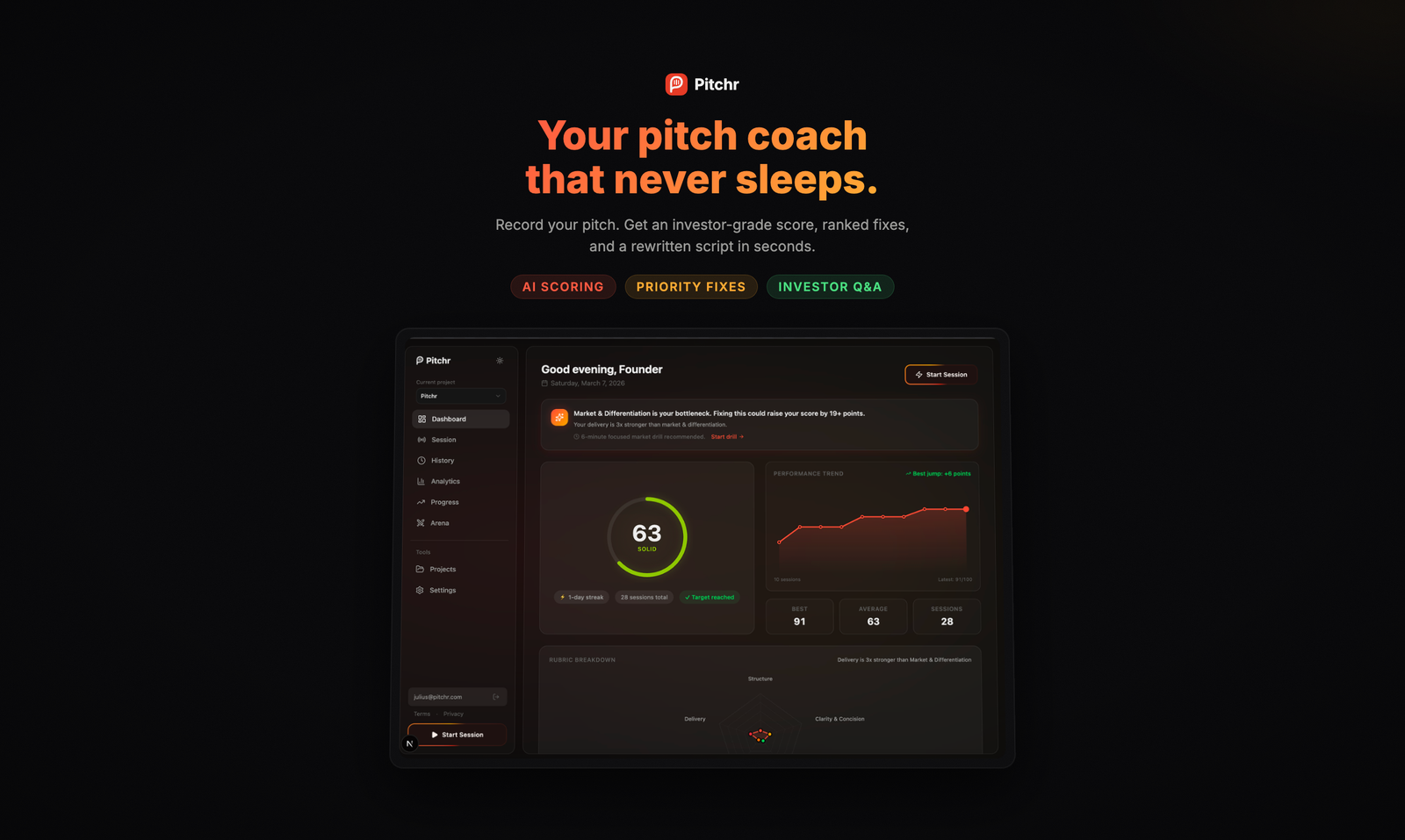 Pitchr é uma plataforma que otimiza o preparo de pitches para investidores, oferecendo avaliação instantânea, sugestões de melhorias e acompanhamento do progresso, facilitando rodadas de captação mais eficazes e rápidas.