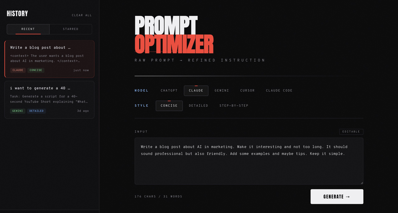 Descrição da ferramenta: O Prompt Optimizer aprimora comandos para IA, utilizando técnicas avançadas de engenharia de prompts. Ele analisa entradas brutas e as reconstrói em instruções precisas, garantindo respostas de alta qualidade para diversos usos profissionais.